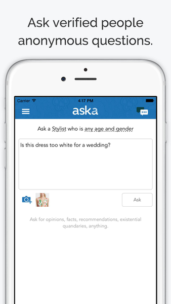 Aska is an iOS app that lets you anonymous ask questions and have them answered by verified experts and enthusiasts