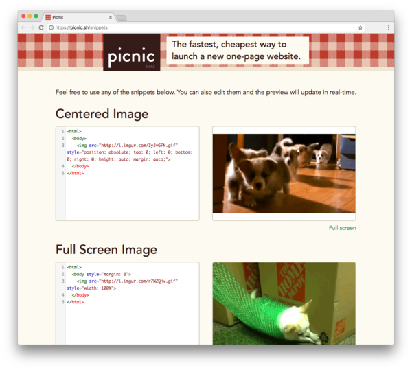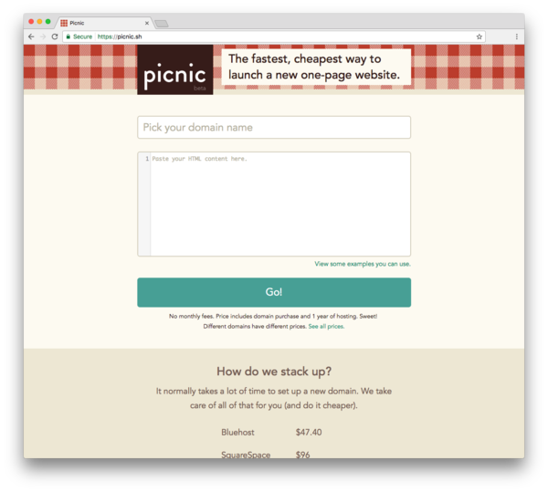 Picnic is a web app where you can make a website with one click in under 5 minutes